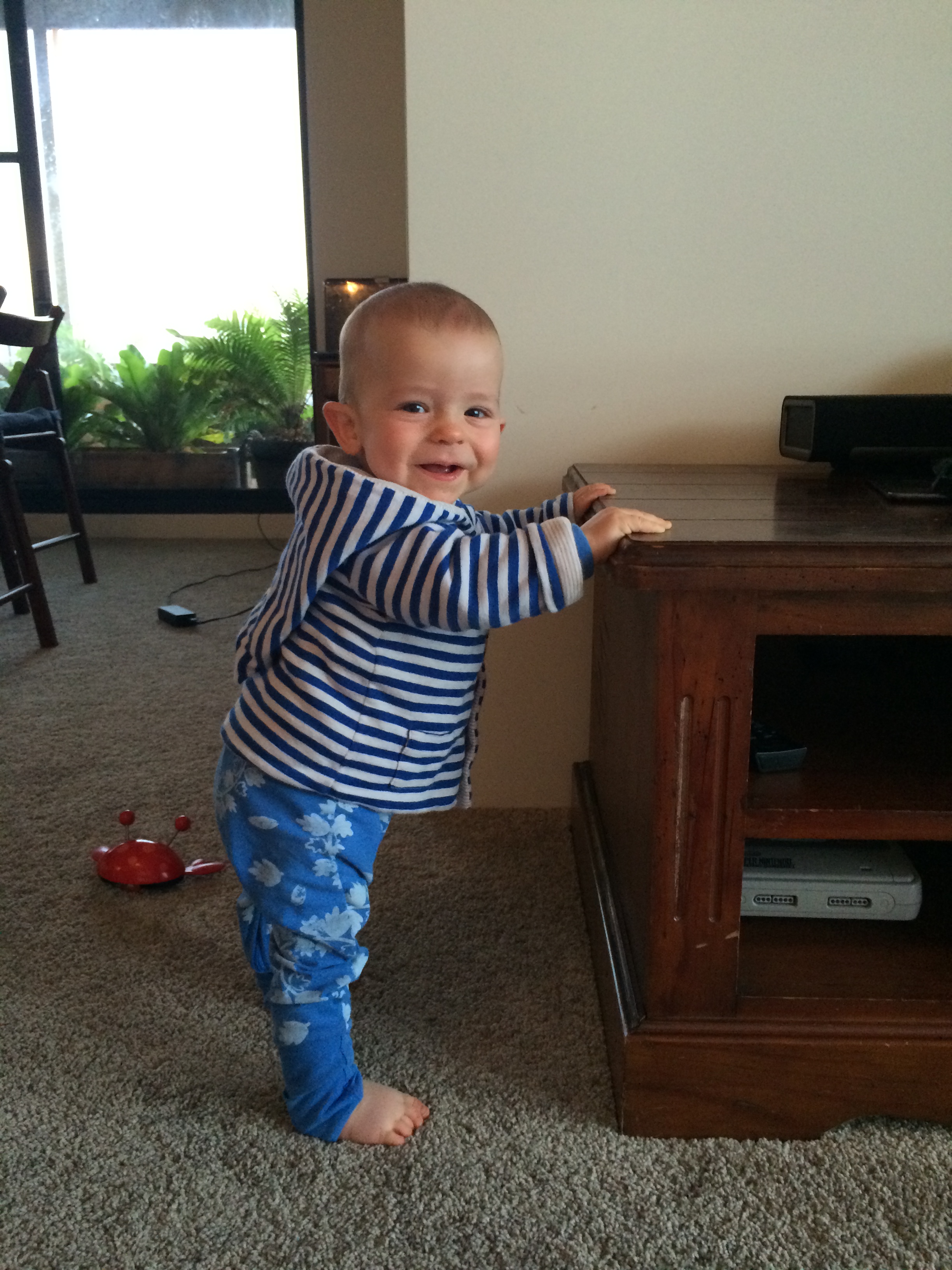 Not much active fathering was then required as Milo chased the cats around the living room, giggling maniacally and occasionally getting himself into situations that he needed help out of; his strength and confidence are not yet matched by coordination and balance.