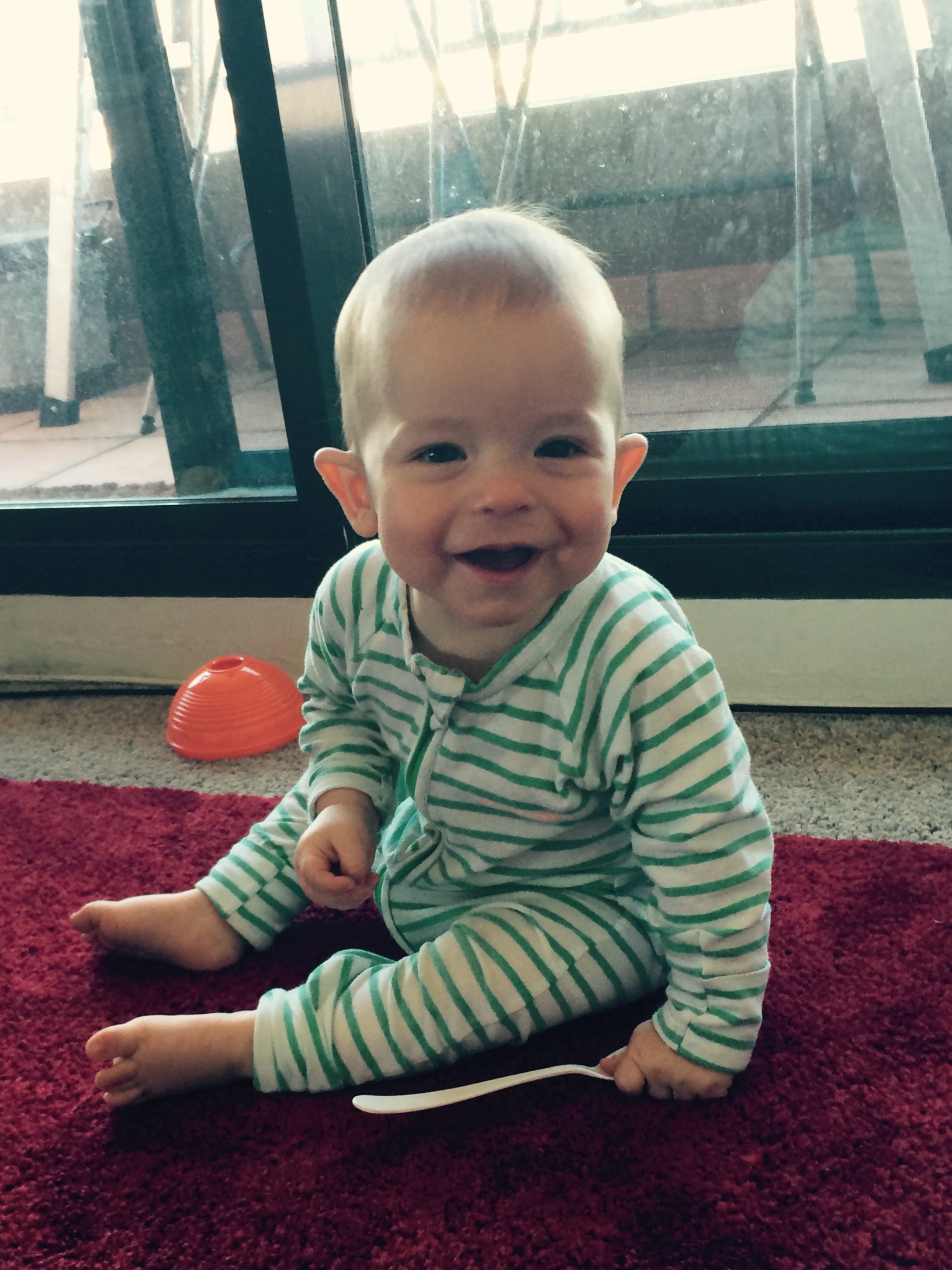Milo has been dragging the spoon around with him for three or four days now; clenched between his teeth like a pirate’s cutlass while he crawls, or more usually clasped in one hand which slows him down and causes him to crawl as if he has a peg leg; swinging his right hand around in a wide arc while grinning like a lunatic, so pleased with what he has found.