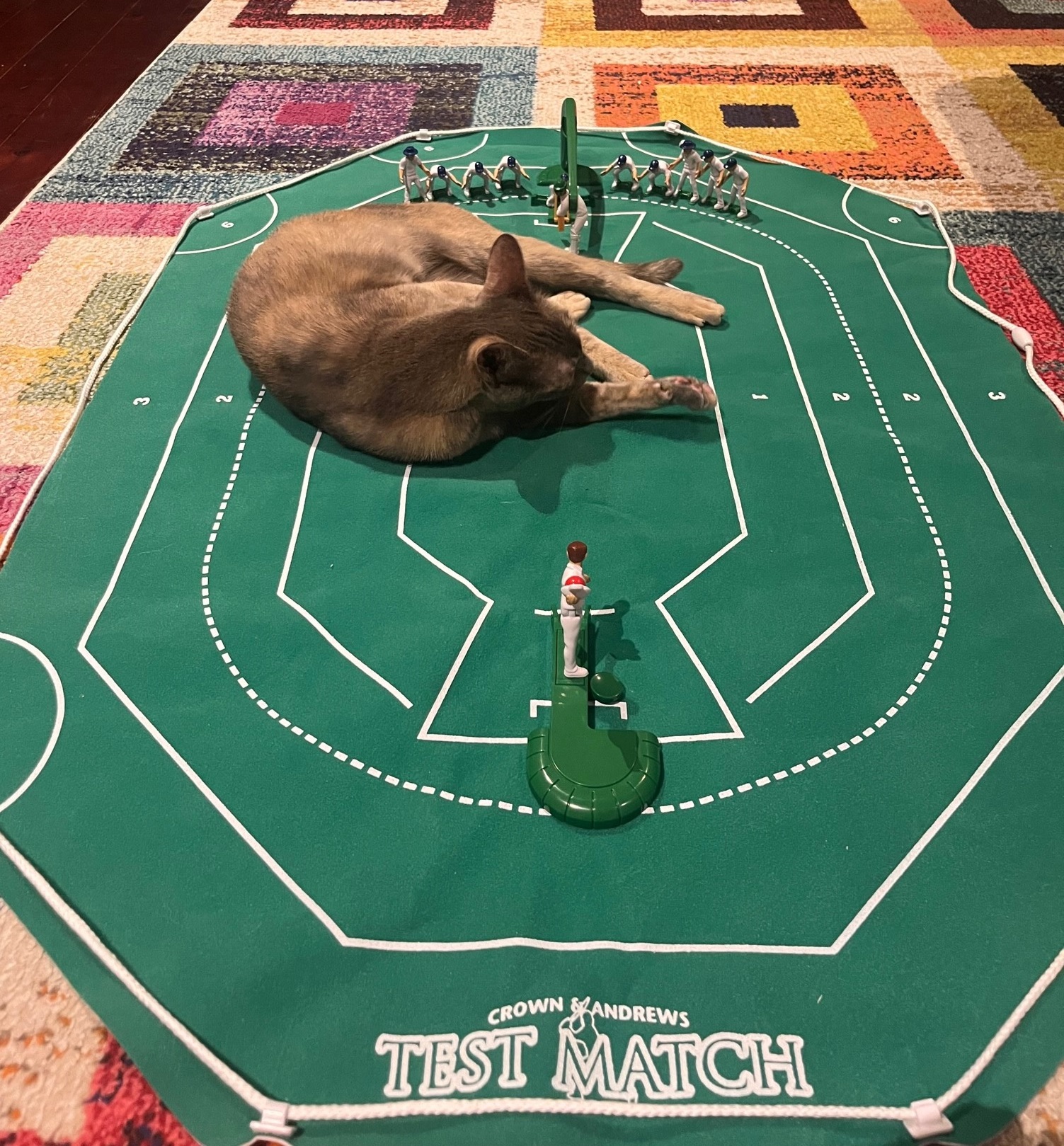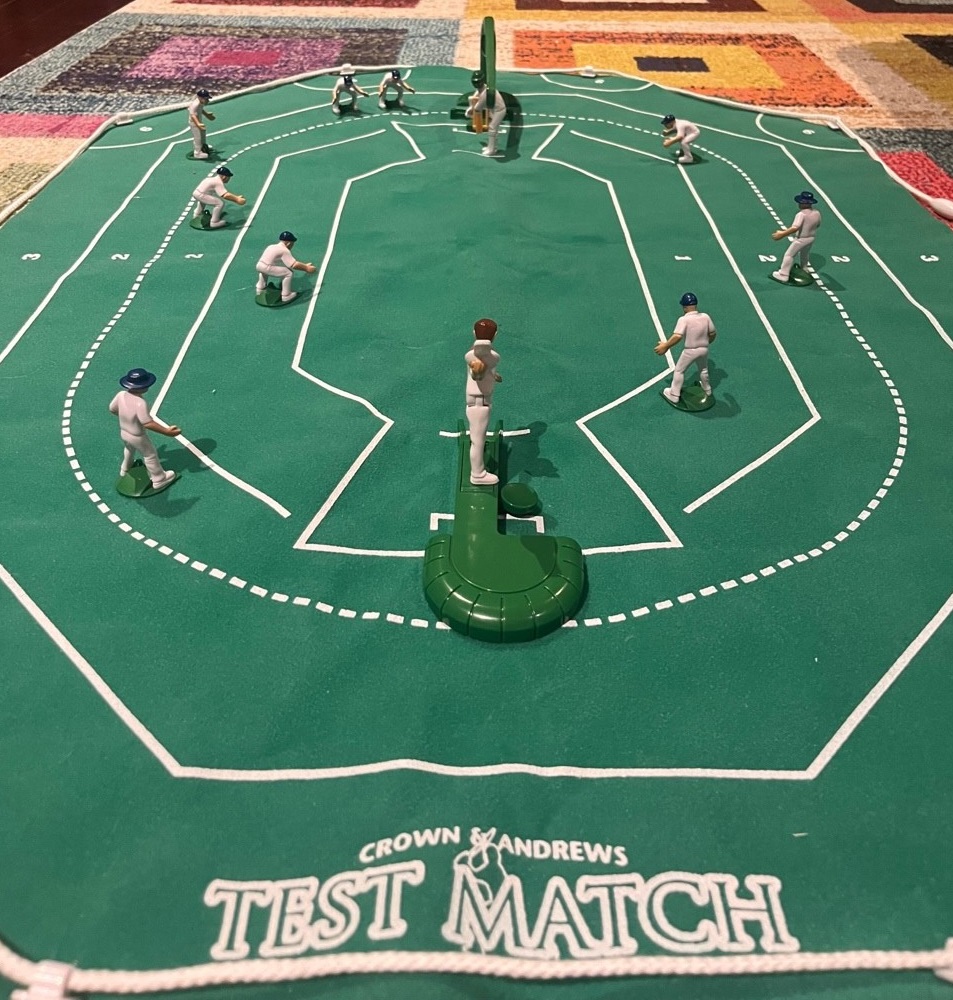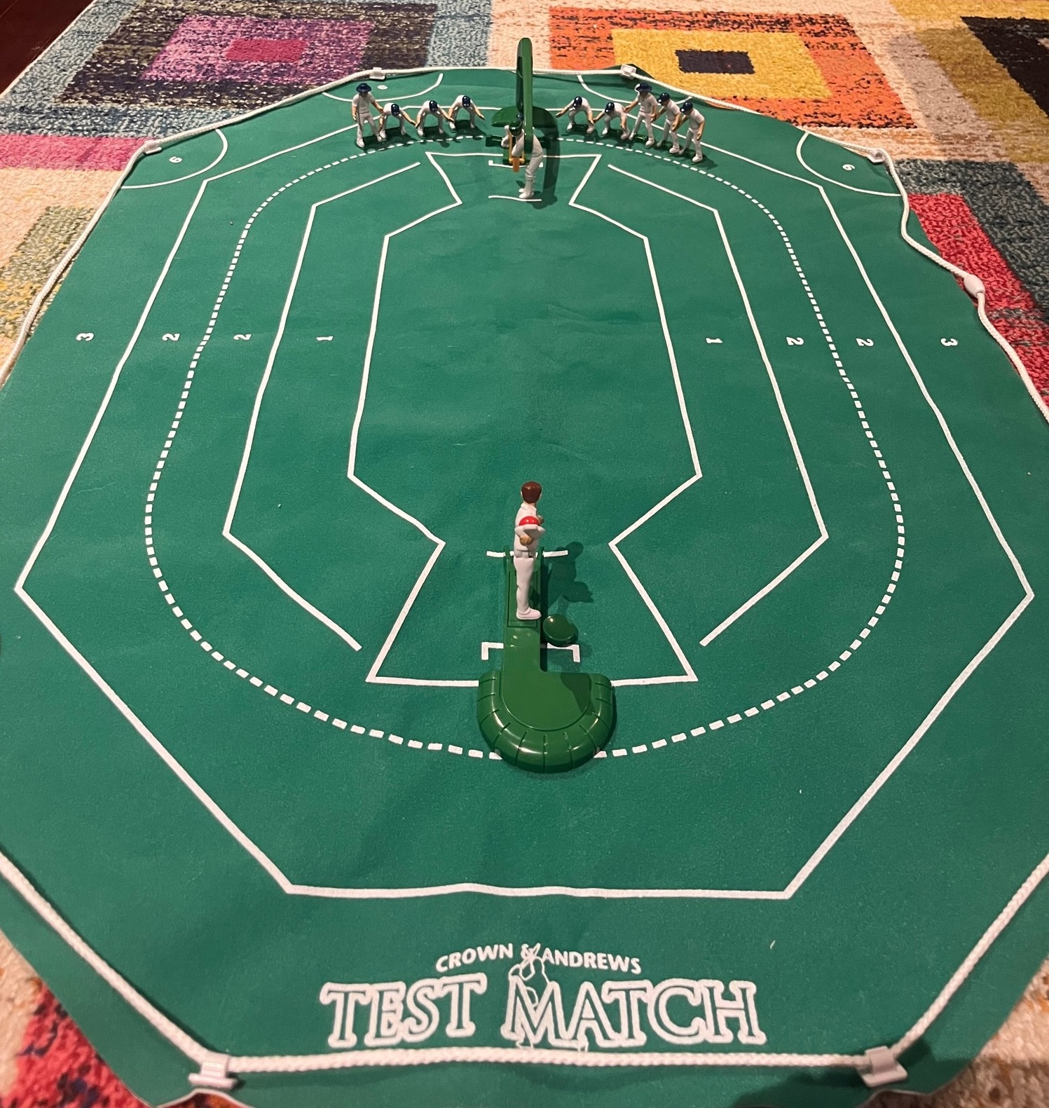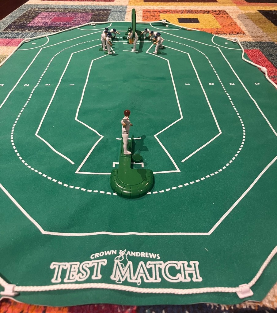 Essentially, you roll out this mini cricket oval made of green felt, about the size of a small coffee table then arrange little plastic fielders around it. There is a batter attached to a long plastic arm and an elbowless bowler, spring-loaded at his waist who hurls beamers or grubbers, but nothing in between.