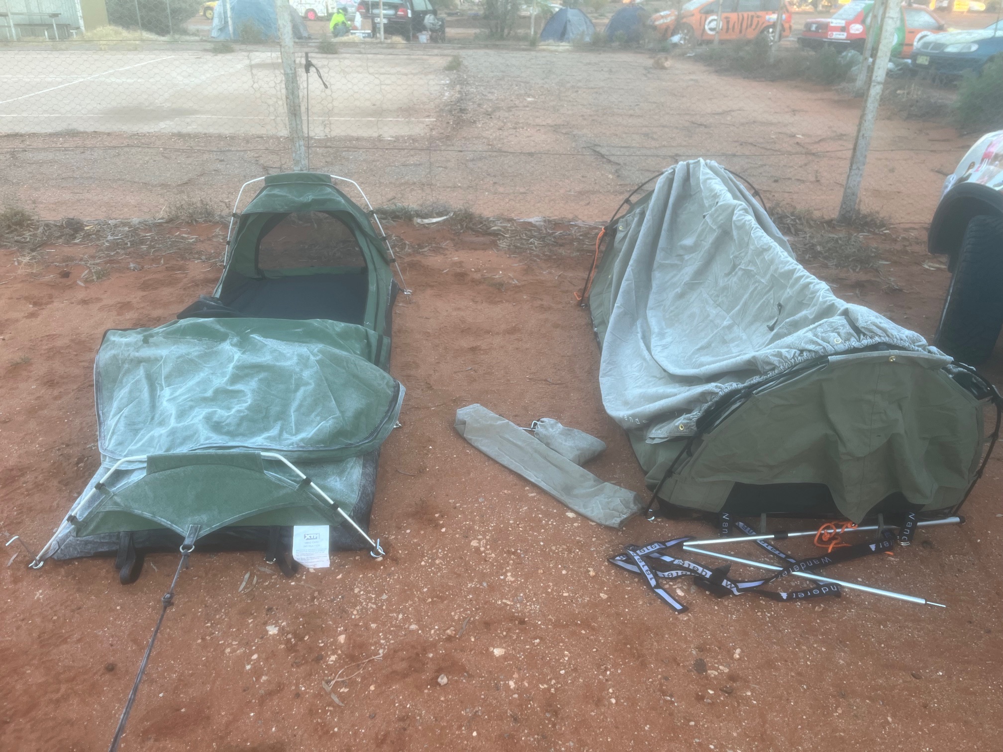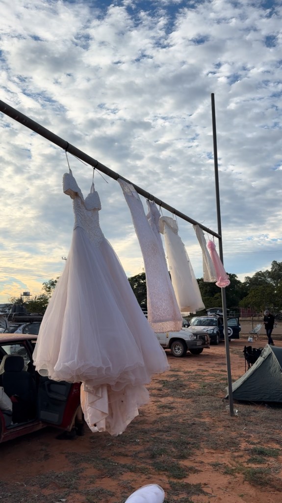 When we awoke on day 5, some of the soiled and tattered wedding dresses from yesterday’s adventure had been affixed to a set of nearby rugby posts, billowing silently in the wind. They reminded me of the trussed-up dingoes we had seen swinging gently from trees, south of the wild dog fence. It was simultaneously captivating and unsettling.
