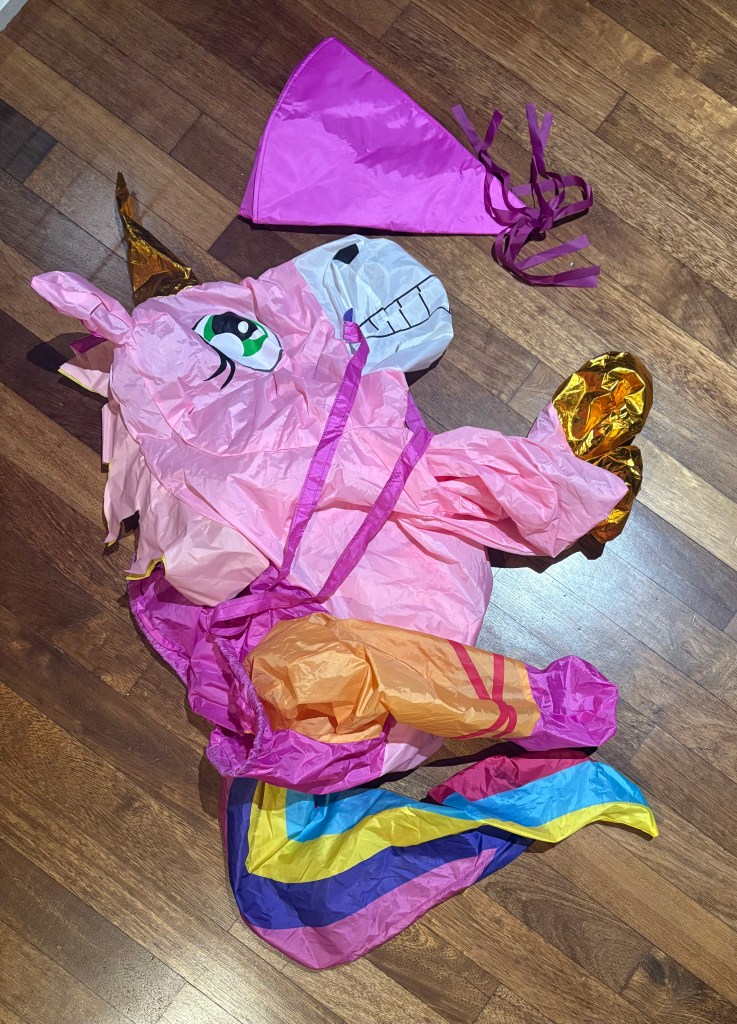 Actually, he handled this heartbreaking moment for me with complete grace. He asked politely, acknowledged Monty’s feelings, made his case quietly, respectfully and succinctly, agreed we’d had some good times in the past, and then strode off towards his classroom and his adult life… leaving me standing in the carpark in the drizzle, dressed as an inflatable, bedazzled unicorn, with a misshapen, pointy pink hat perched on my head, shoulders slumped forward, eyes moistening, now with only one child prepared to hold my hand in public.